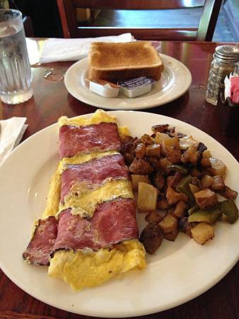 價錢蠻可親的,我點了一份Pastrami Eggs,附馬鈴薯塊+烤吐司=$7.62(含稅)。